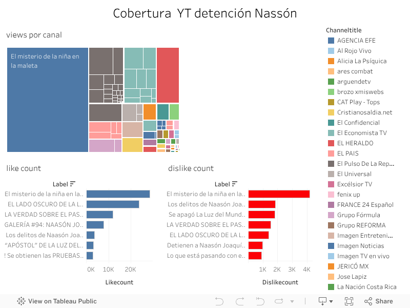 La visualización muestra, en la parte superior, los videos de YouTube (representados por cuadros) recomendados por el algoritmo, con mayor número de reproducciones hasta el 12 de junio de 2019. En la parte inferior (representados por gráficas azul y roja), se muestran los títulos de videos recomendados por mayor número de likes y por mayor número de dislikes hasta la misma fecha.