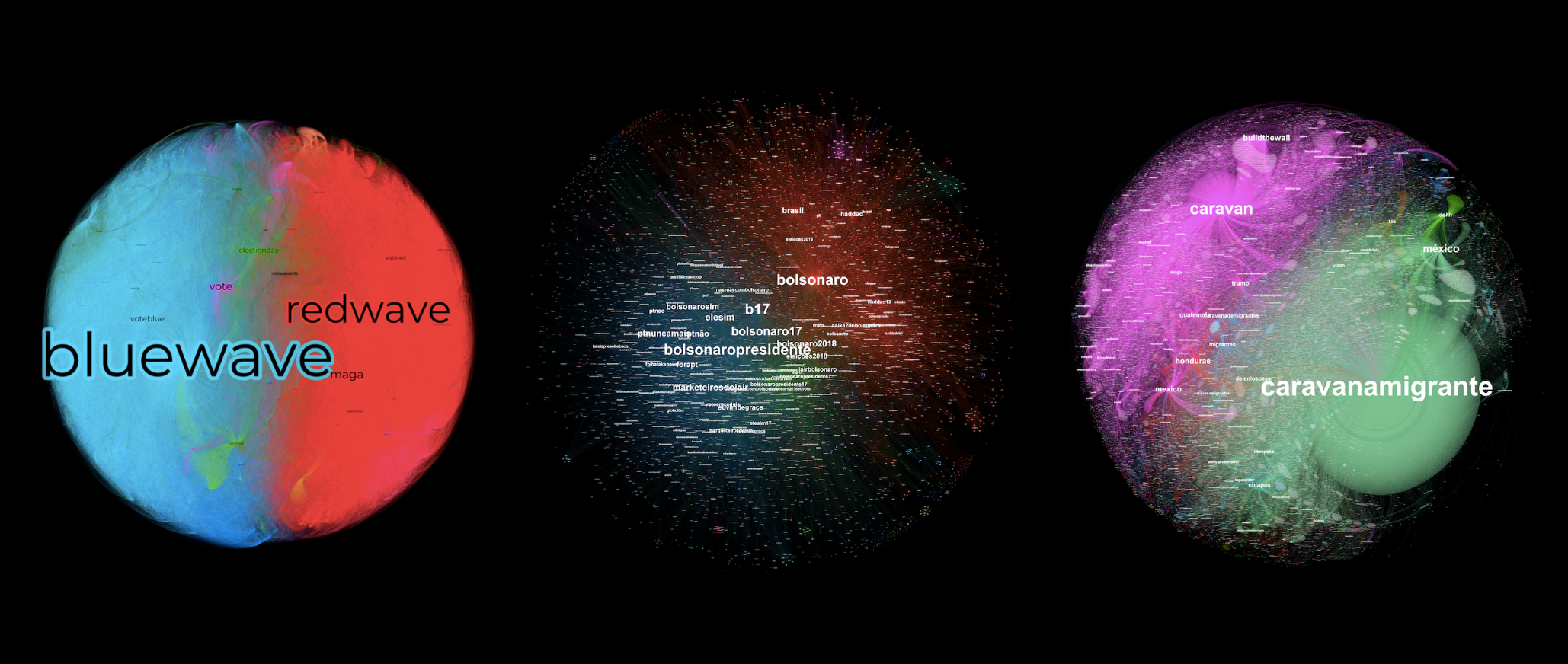 El conjunto de grafos muestra tres ejemplos de polarización en la discusión política actual: la elecciones al congreso estadounidense, la campaña electoral en Brasil y la disputa alrededor de las personas a favor y en contra de Bolsonaro.