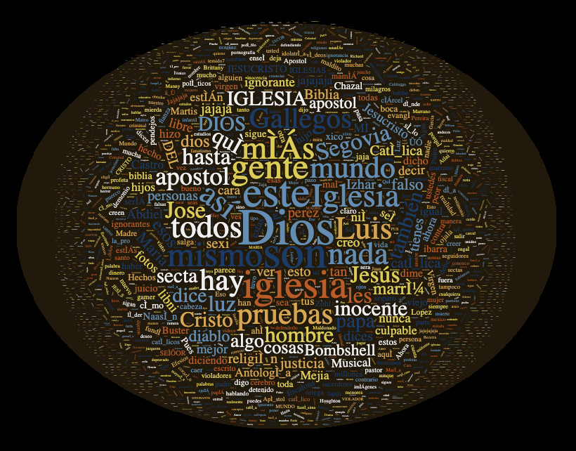 Nube de palabras utilizadas con mayor frecuencia en el contenido de los comentarios al mismo video, “Difunden imágenes de Naasón Joaquín García, líder de ‘La Luz del Mundo’, detenido en California Estados Unidos”, publicado en el canal oficial de Noticieros Televisa en Youtube.
